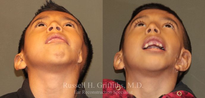 Kevin was born with left hemifacial microsomia and grade 3 microtia with complete aural atresia. He has characteristic underdevelopment of the left side of his face, deviation of his jaw to his left, and placement of his microtia remnant in the center of his cheek. His ear was reconstructed in a single surgical stage. Some of his post op photos were taken at 10 months postoperative and others at nearly 2 years postoperative. Dr. Griffiths counsels patients with hemifacial microsomia to expect less of a result because of the associated deformities and tissue deficiencies. This child's ear shows variation in color which is occasionally seen in children with darker skin color.