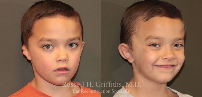 Cree was born with grade 3 microtia and complete aural atresia. He underwent complete reconstruction of his external ear and ear canal in a single operation (CAM). His own rib graft was carefully carved to match each detail of his left ear. The photos on the right were taken over 1 year after surgery. CLICK PHOTO TO ENLARGE