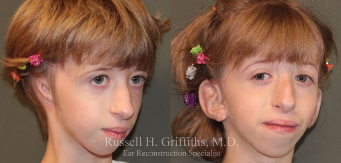 Olivia was born with bilateral grade 3 microtia and aural atresia. Each ear and ear canal was reconstructed in a single stage utilizing a Medpor framework (CAM). Her left ear was reconstructed first and her right ear was done 4 months later. Both surgeries were completed under a single year insurance deductible. The photos on the right were taken over one year postoperatively. This gal is an incredible comedian. She had us laughing every time she came into our office. We predict that she will be on the Jimmy Fallon show someday.
